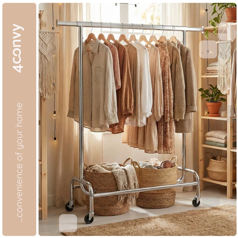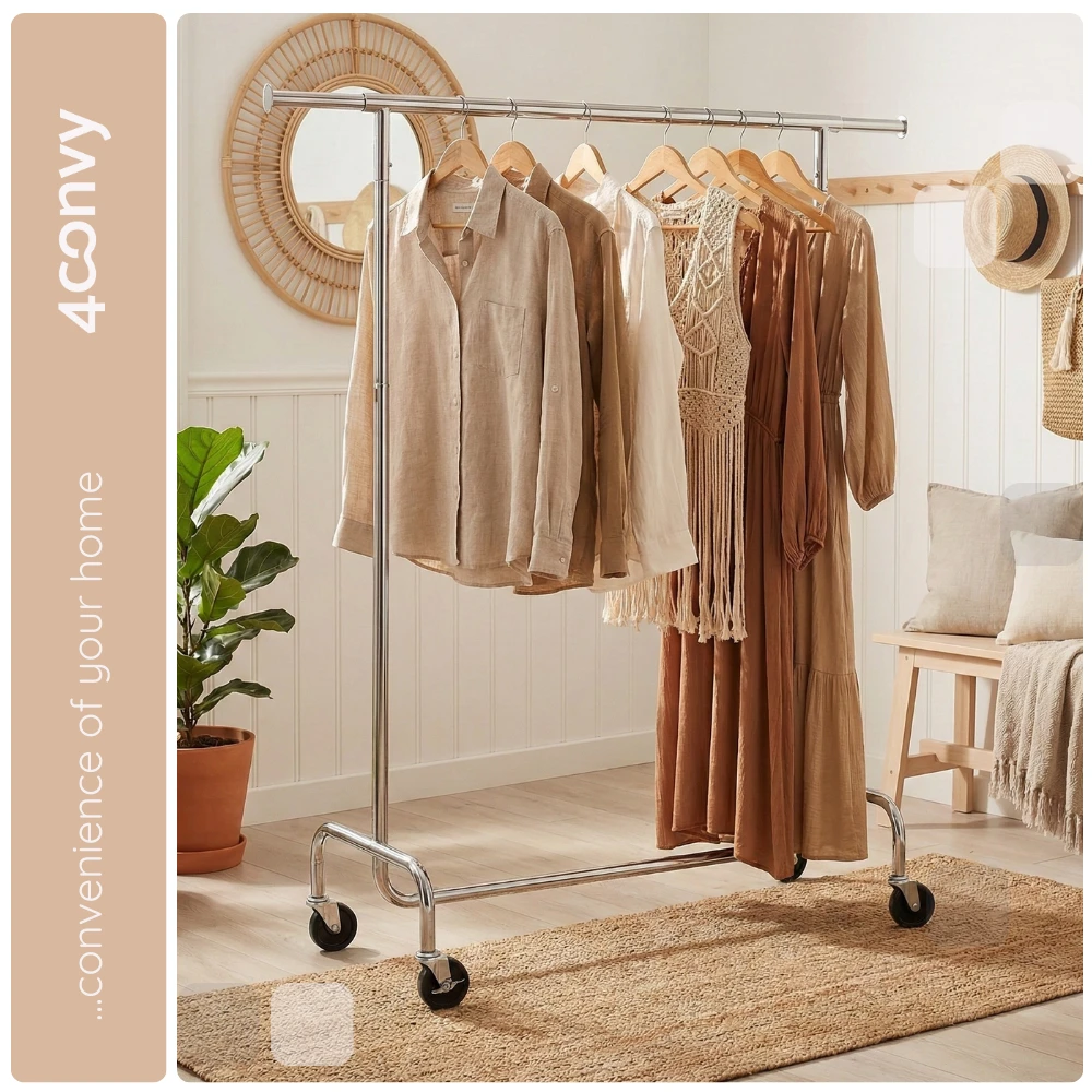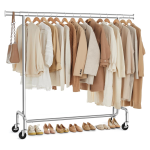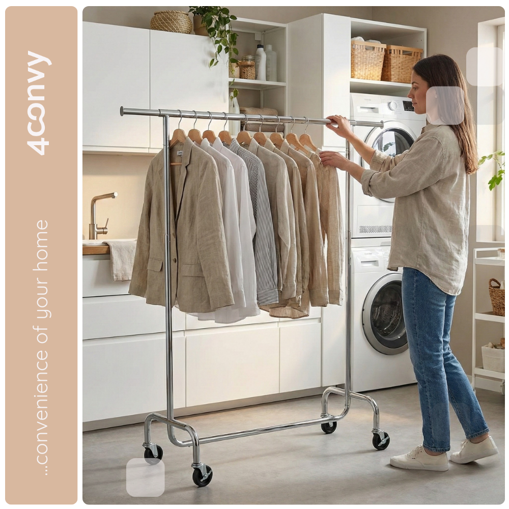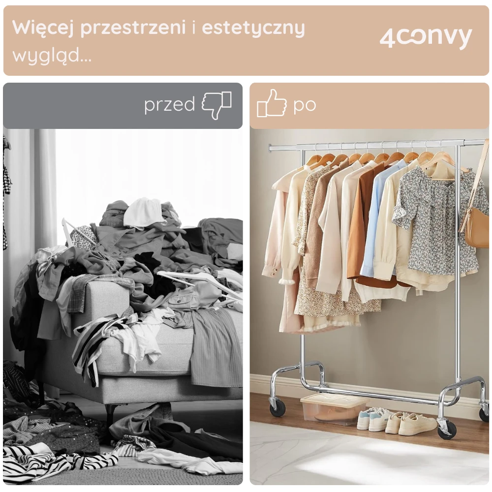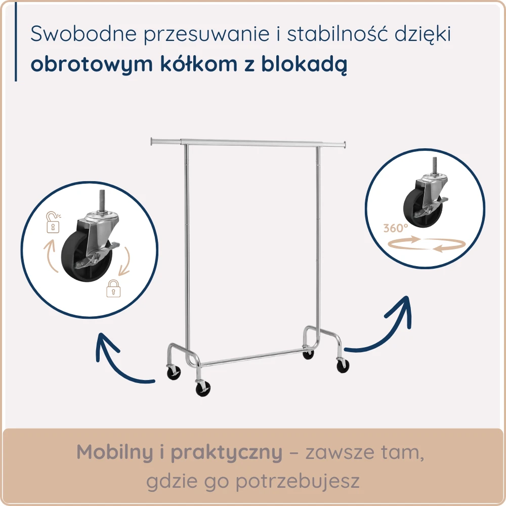 - MOBILNY - Dzięki czterem kółkom obrotowym 360° (w tym dwóm z blokadą) łatwo przesuniesz wieszak w dowolne miejsce i zablokujesz go tam, gdzie potrzebujesz.