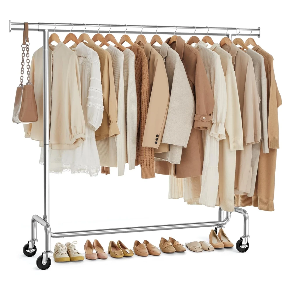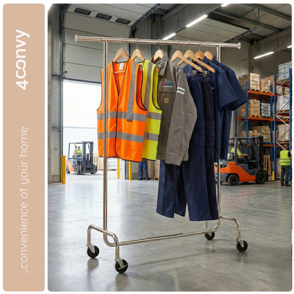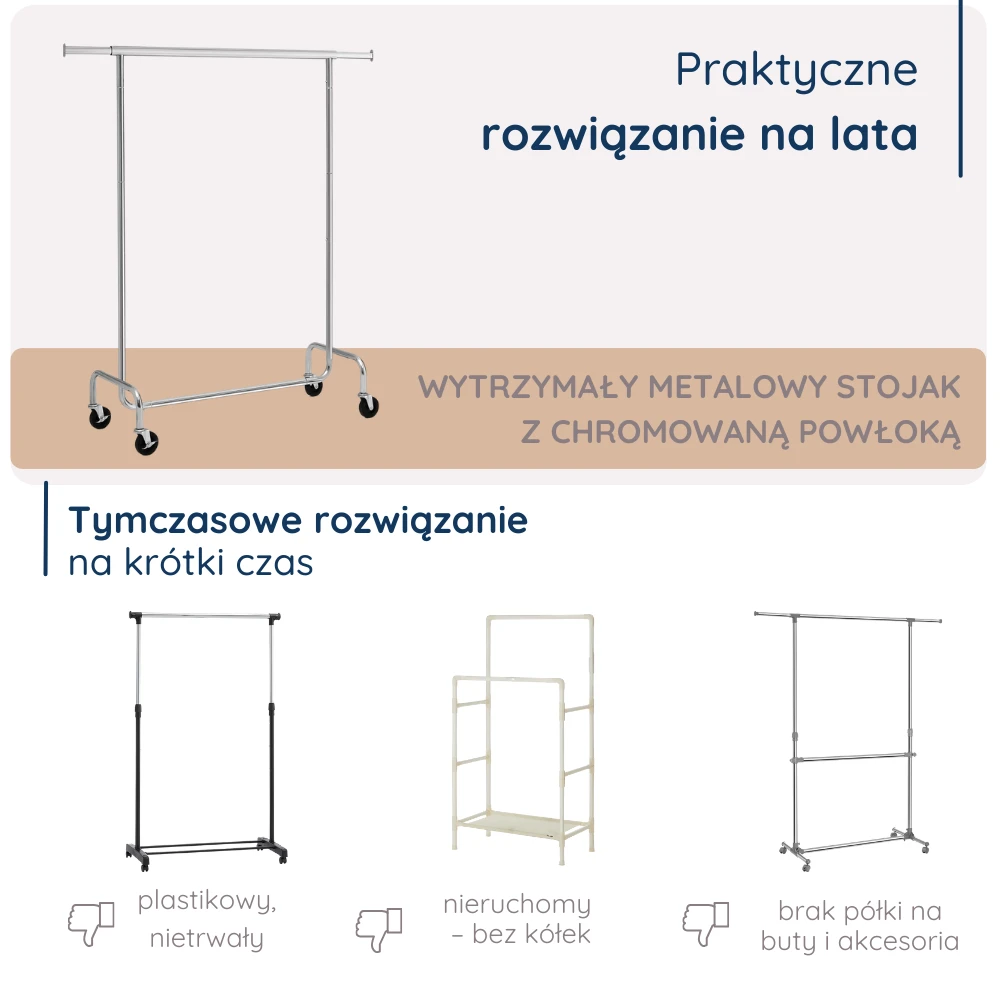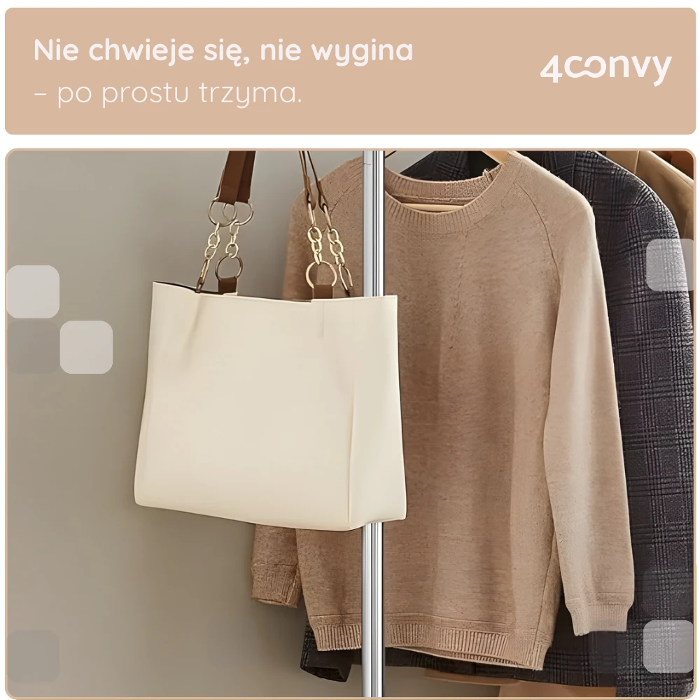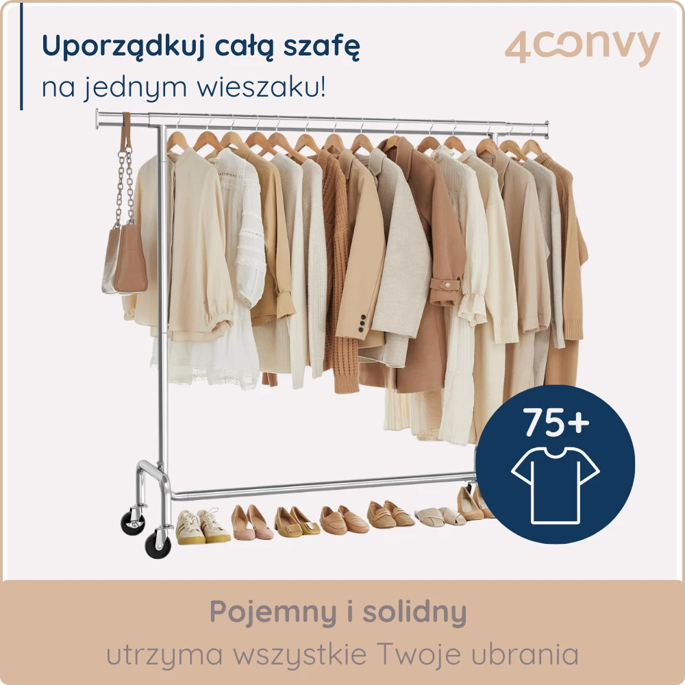 - WYTRZYMAŁY I STABILNY - Grube stalowe rurki oraz mocne kółka sprawiają, że wieszak bez problemu utrzyma ciężar do 130 kg – idealny nawet na płaszcze czy zimowe kurtki.