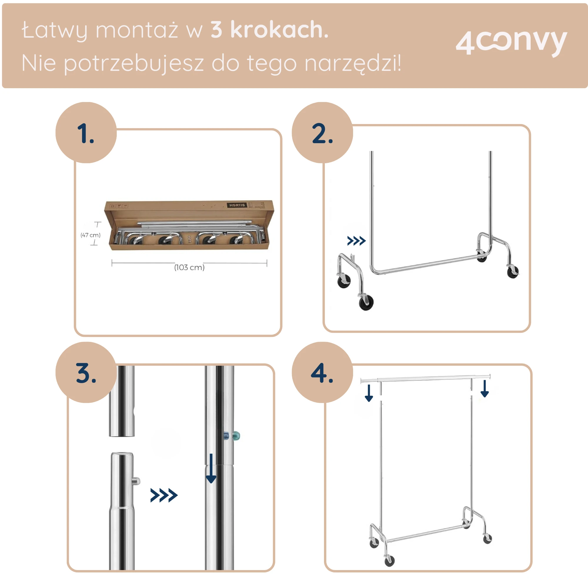 Nie, stojak złożysz bez użycia narzędzi i bez skręcania. Wystarczy odpowiednio wsunąć wszystkie elementy w zaledwie kilku krokach.