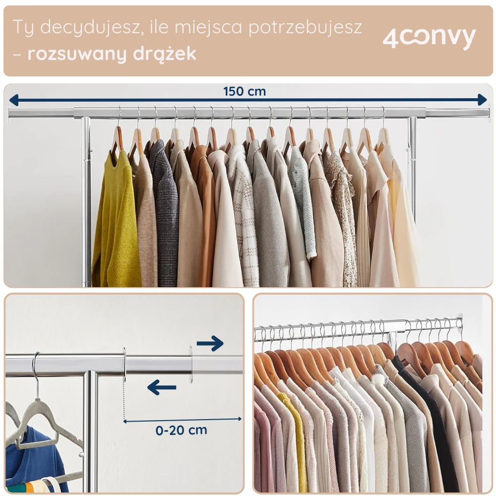 - WIĘCEJ MIEJSCA - Górny drążek wysuwa się z 110 do 150 cm (po 20cm z każdej strony), co możesz wykorzystać do zawieszenia nawet ponad 75 sztuk odzieży.