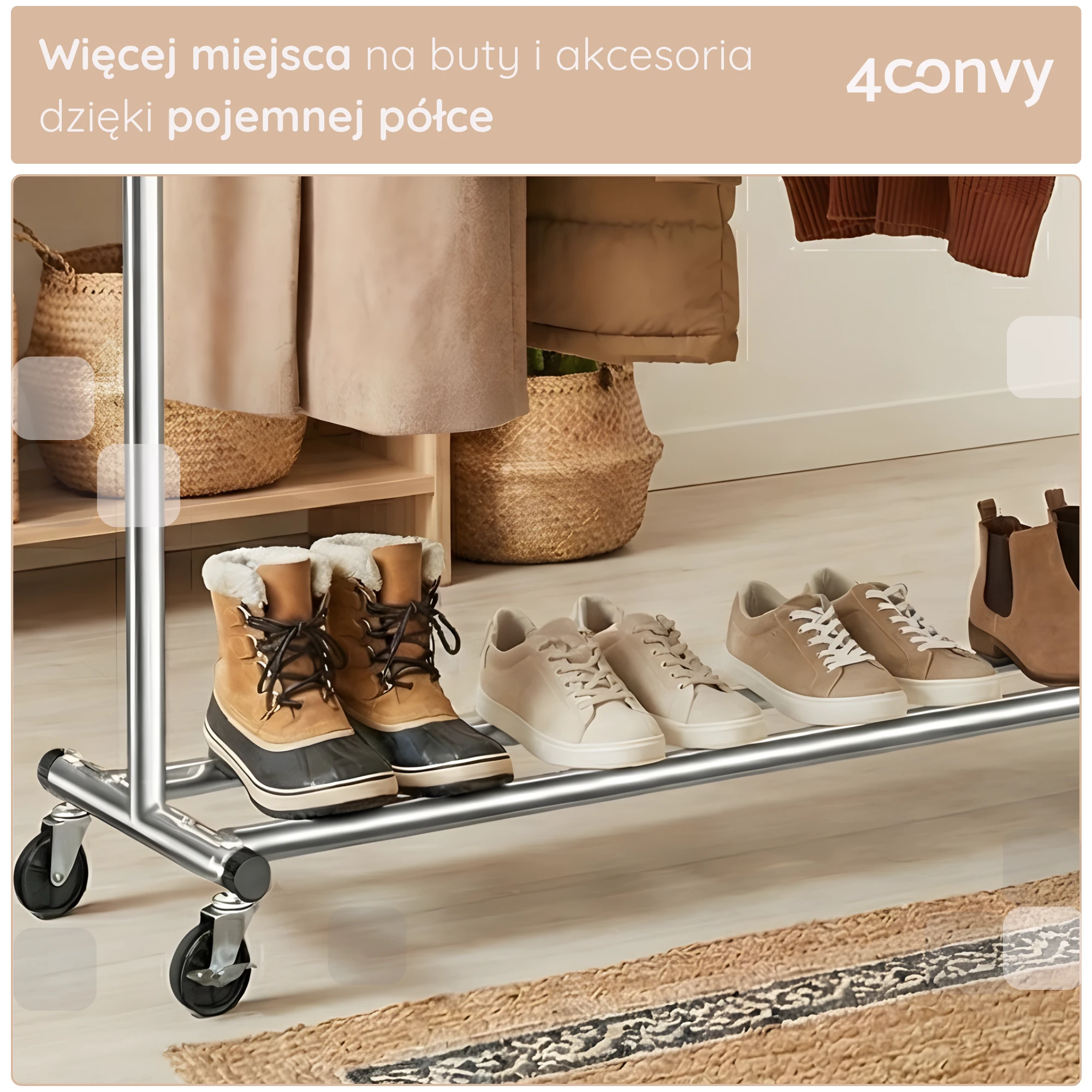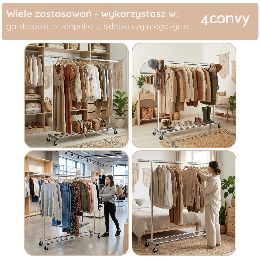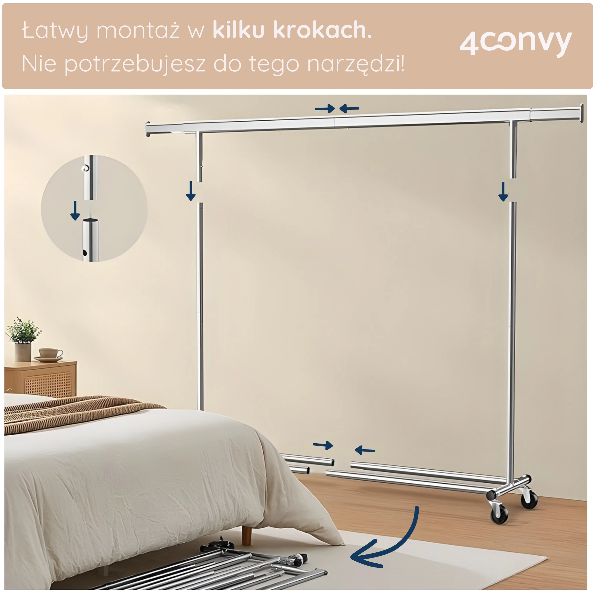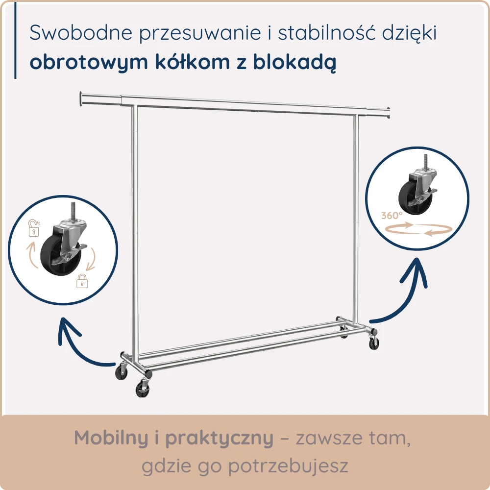 - MOBILNY - Dzięki czterem kółkom obrotowym 360° (w tym dwóm z blokadą) łatwo przesuniesz wieszak w dowolne miejsce i zablokujesz go tam, gdzie potrzebujesz.