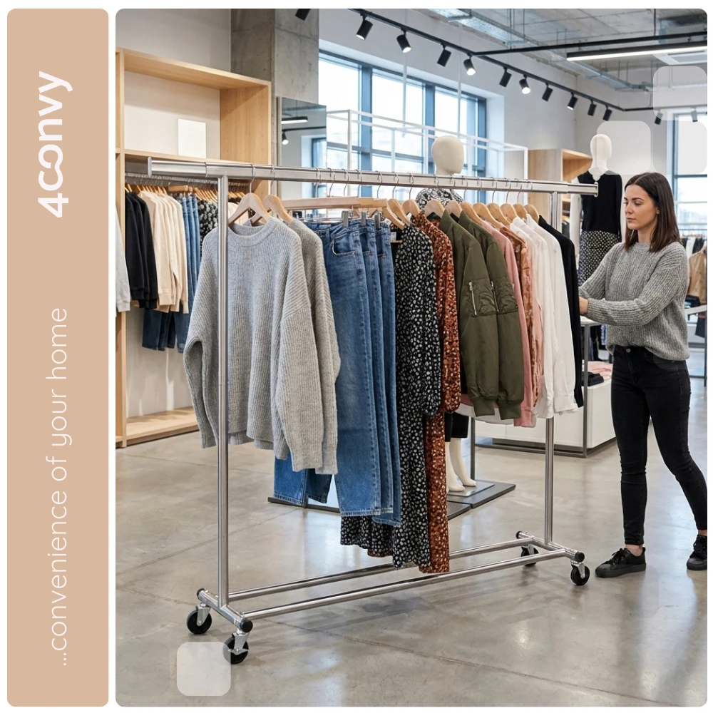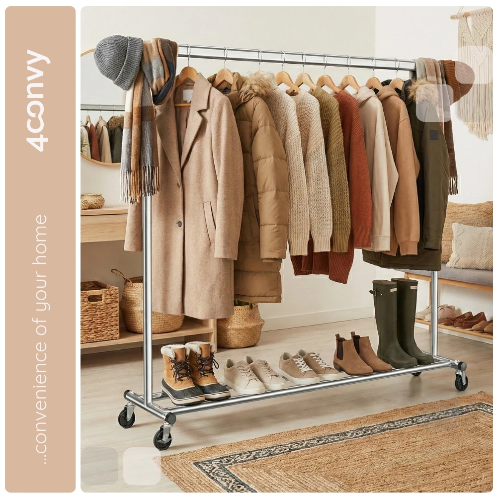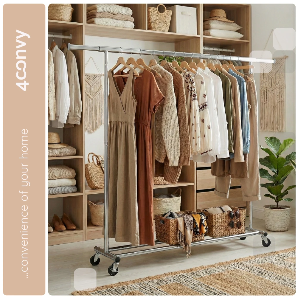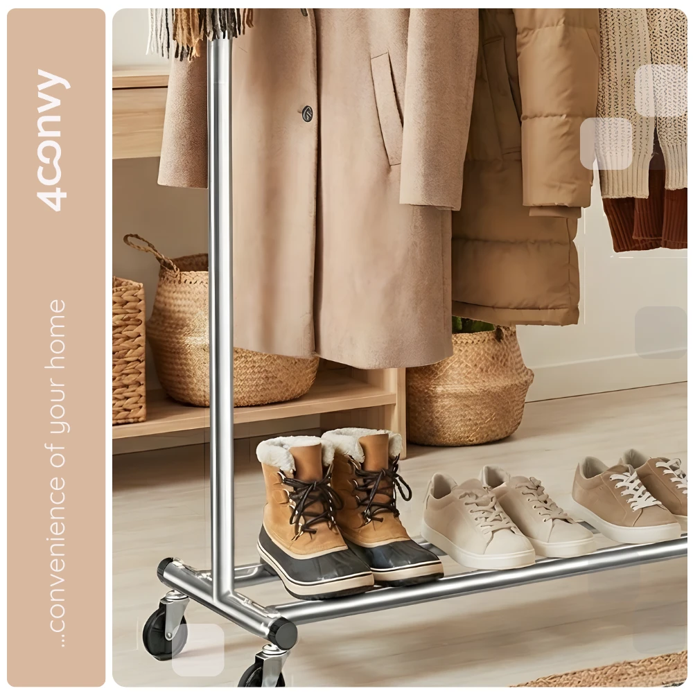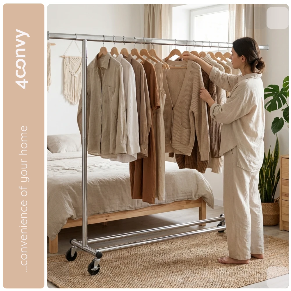 - MOBILNY - Dzięki czterem kółkom obrotowym 360° (w tym dwóm z blokadą) łatwo przesuniesz wieszak w dowolne miejsce i zablokujesz go tam, gdzie potrzebujesz.