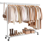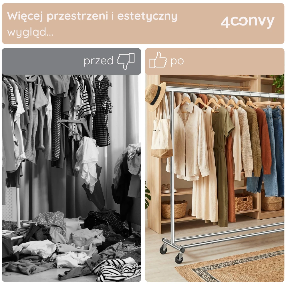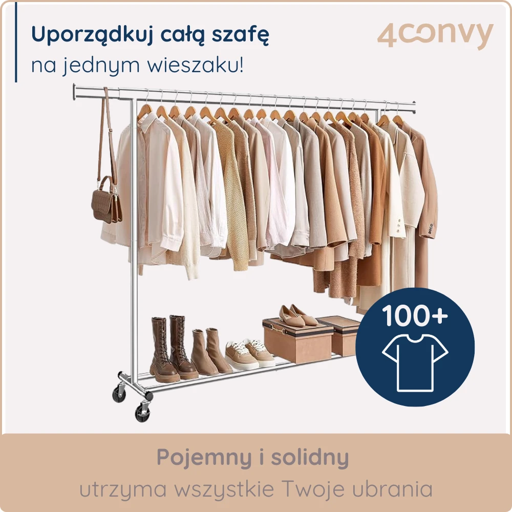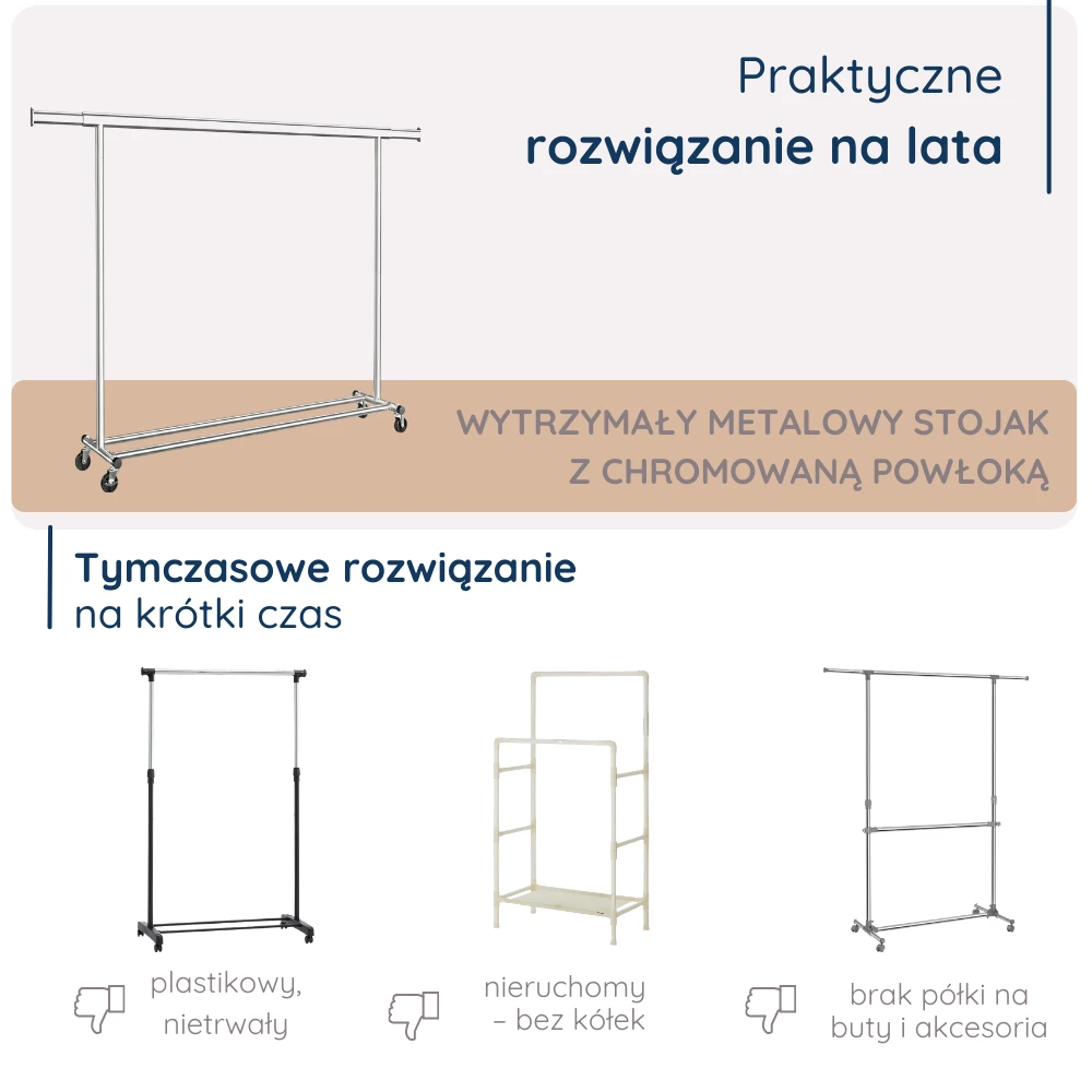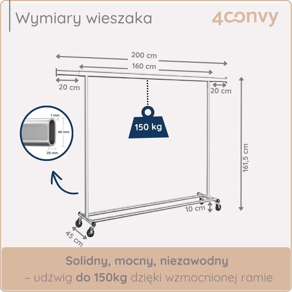- NAJWYTRZYMALSZY - Grube stalowe rurki oraz mocne kółka sprawiają, że wieszak bez problemu utrzyma ciężar do 150 kg – idealny nawet na płaszcze czy zimowe kurtki.
