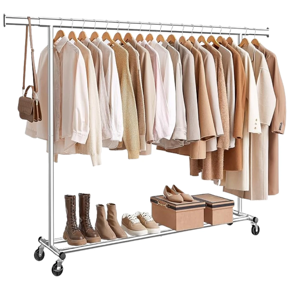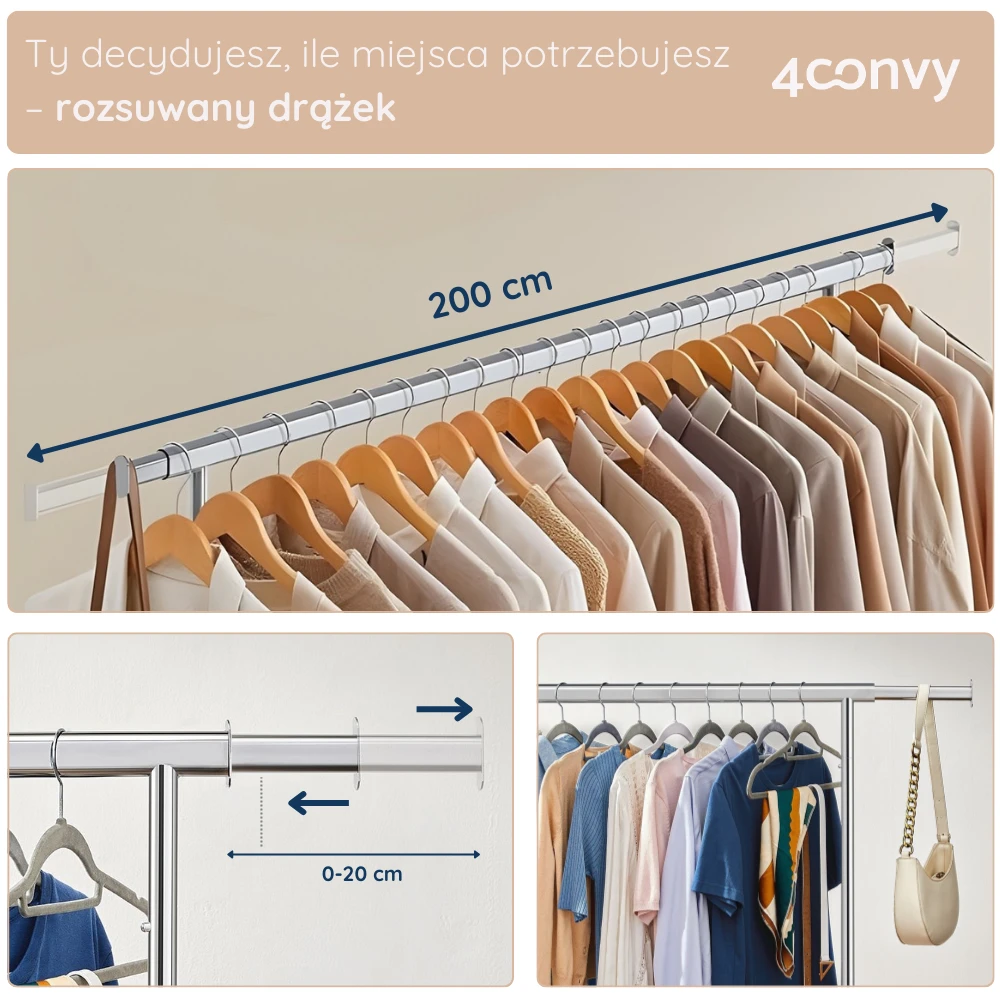- NAJWIĘCEJ MIEJSCA - Górny drążek rozsuwa się z 160 do 200 cm (po 20cm z każdej strony), co możesz wykorzystać do zawieszenia nawet ponad 100 sztuk odzieży. Dolna półka idealnie sprawdzi się do ustawienia pojemników do przechowywania lub butów.