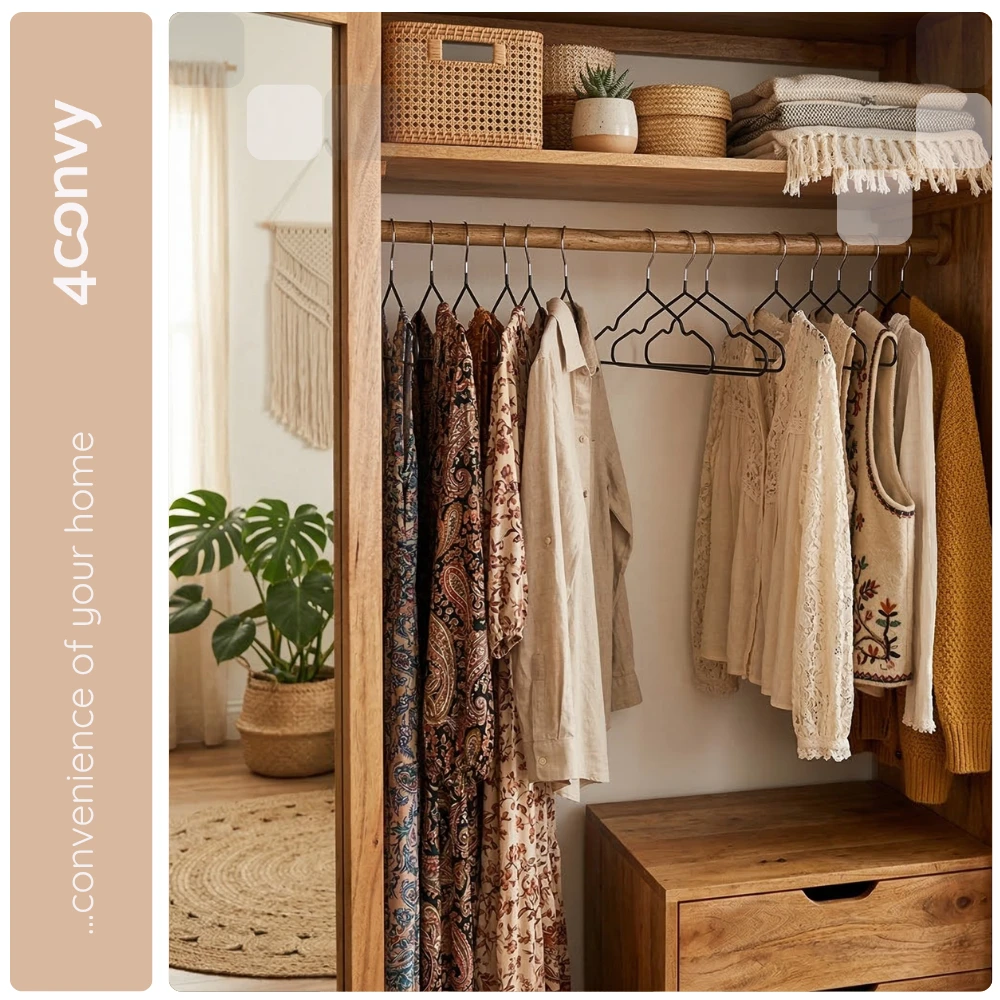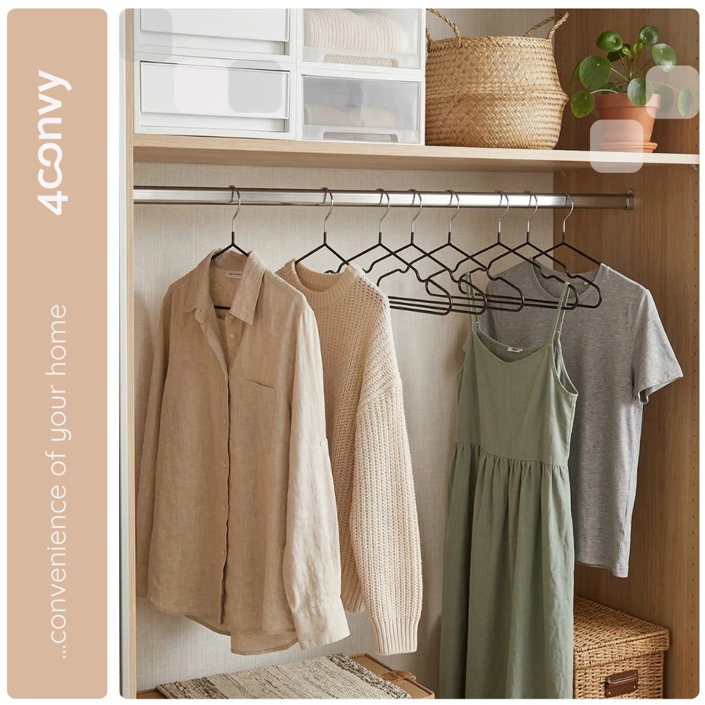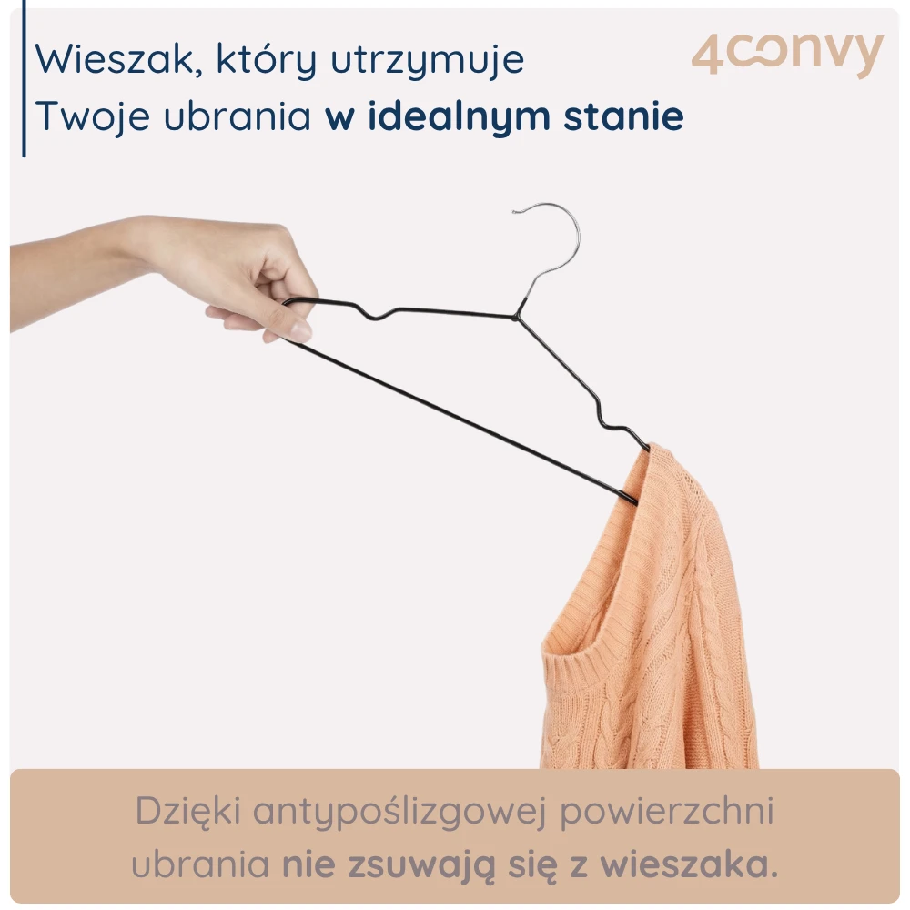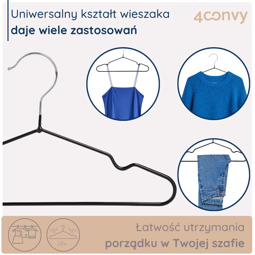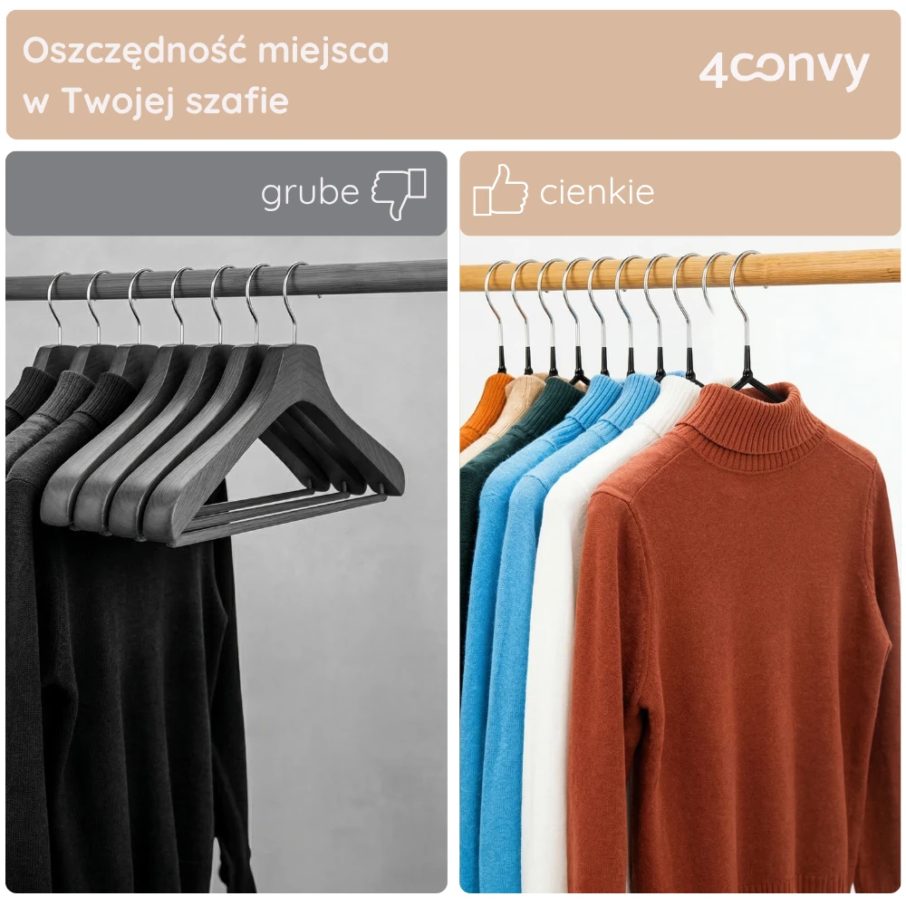 Wieszaki 4CONVY są węższe od standardowych modeli, co pozwala zaoszczędzić miejsce i zmieścić w szafie znacznie więcej ubrań. Jednocześnie solidna, metalowa konstrukcja zapewnia niezawodną trwałość na lata.