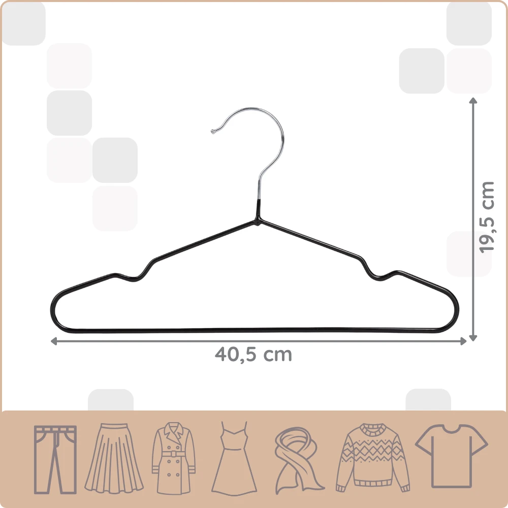 Wieszaki posiadają antypoślizgową powłokę z tworzywa, która stanowi doskonałą ochronę dla Twoich ulubionych rzeczy. Metalowa konstrukcja i specjalne wcięcia na ramiączka oraz tasiemki pozwolą wygodnie zawieszać różne rodzaje ubrań. Dzięki nim ubrania nie ześlizgują się, a przez to nie rozciągają i nie spadają na dno szafy.