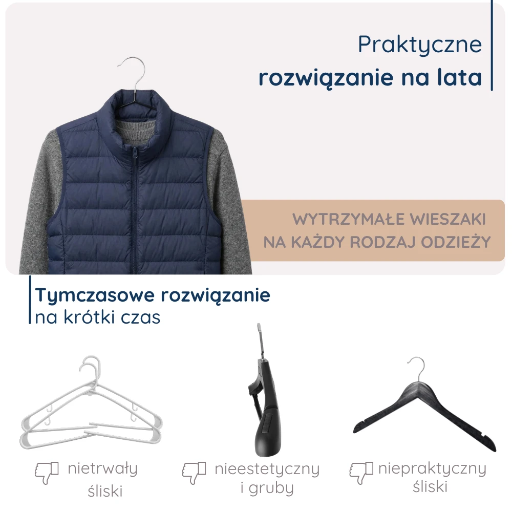 - SMUKŁA KONSTRUKCJA: Ten model zaprojektowano z myślą o maksymalnej oszczędności miejsca do przechowywania. Jego cienka konstrukcja pozwala zmieścić w szafie znacznie więcej ubrań.
