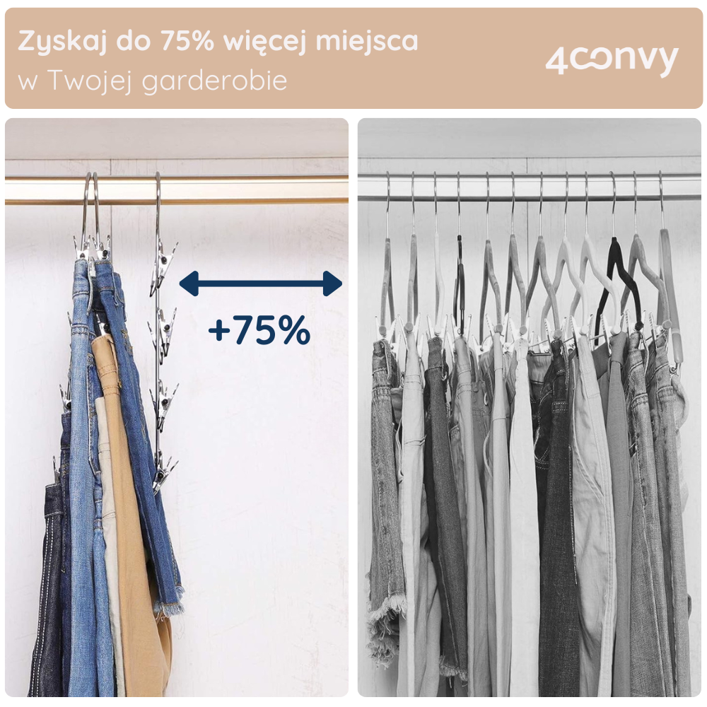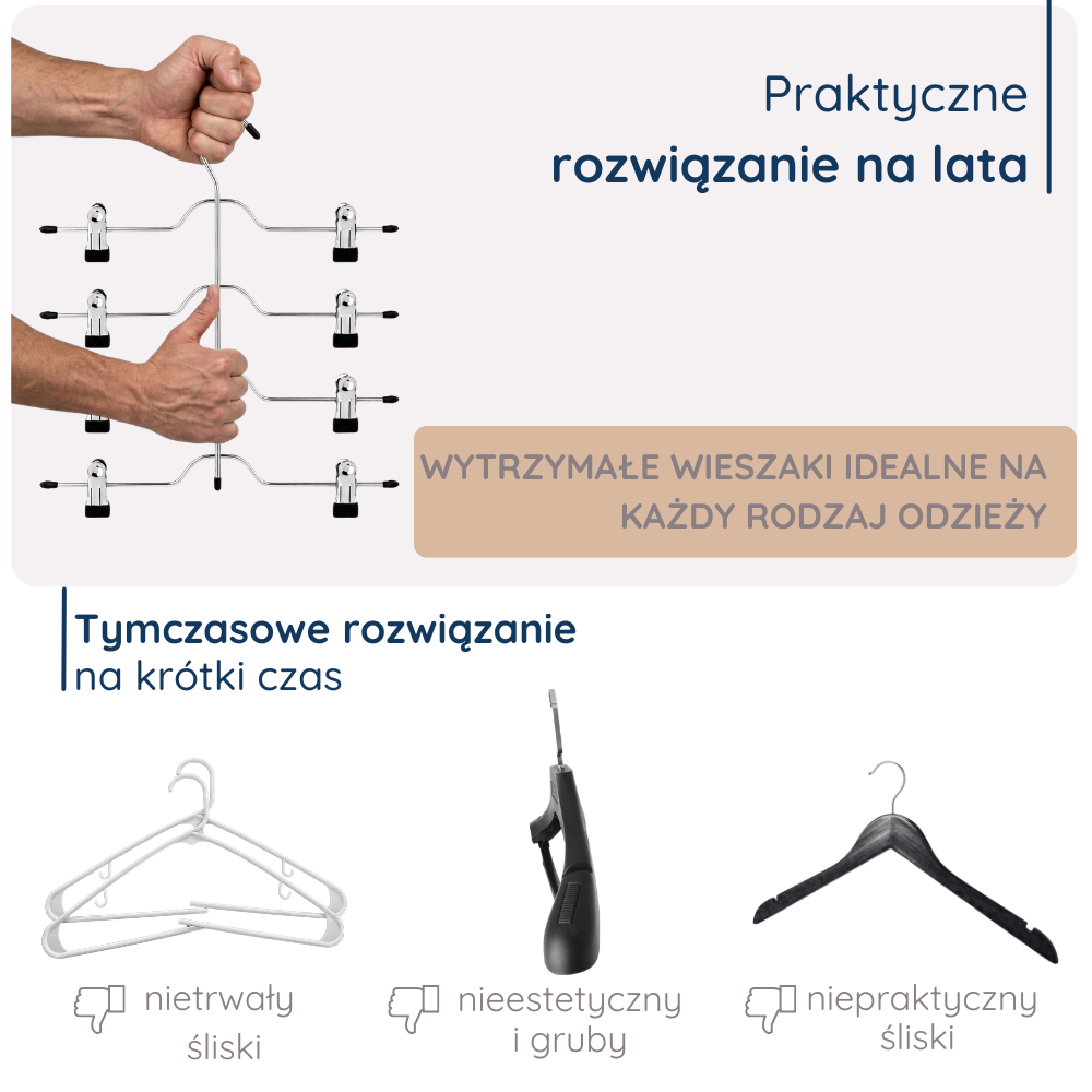 Oszczędź aż do 75% miejsca w swojej szafie! Dzięki innowacyjnej, wielopoziomowej konstrukcji jeden wieszak z powodzeniem zastępuje aż cztery tradycyjne. Jego lekki i smukły profil sprawia, że zajmuje minimum miejsca, pozwalając Ci optymalnie zagospodarować przestrzeń i pomieścić znacznie więcej ubrań – nawet w bardzo małych garderobach.