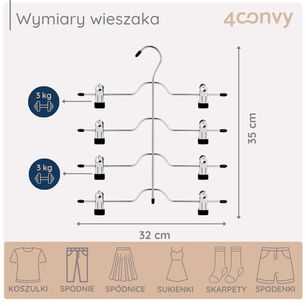Regulowane klipsy z gumowymi końcówkami pokrytymi powłoką PVC pewnie przytrzymują ubrania, nie zostawiając śladów ani uszkodzeń – nawet na delikatnych tkaninach. Dzięki możliwości dopasowania szerokości, wieszaki idealnie nadają się do spodni, spódnic, szalików, krawatów, rękawiczek czy skarpetek.