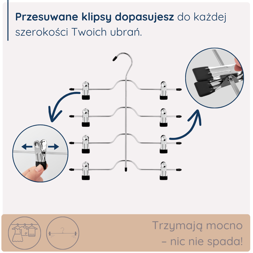- ANTYPOŚLIZGOWE KLIPSY: Metalowe wieszaki posiadają po 2 ruchome klipsy z gumowymi nakładkami, które zapobiegają zsuwaniu się ubrań i nie zostawiają na nich śladów odgnieceń. Klipsy można dowolnie przesuwać, aby dopasować do wybranego rodzaju i rozmiaru ubrania.