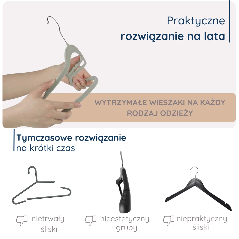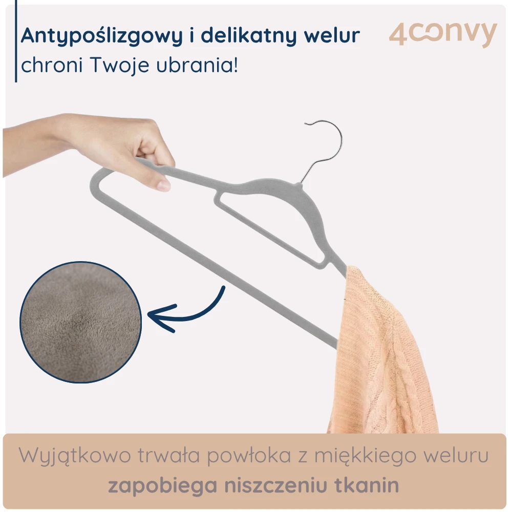 DELIKATNE I ANTYPOŚLIZGOWE WYKOŃCZENIE: Welur nie tylko chroni odzież przed uszkodzeniami, ale też utrzymuje ubrania na swoim miejscu, gwarantując idealny porządek w szafie.