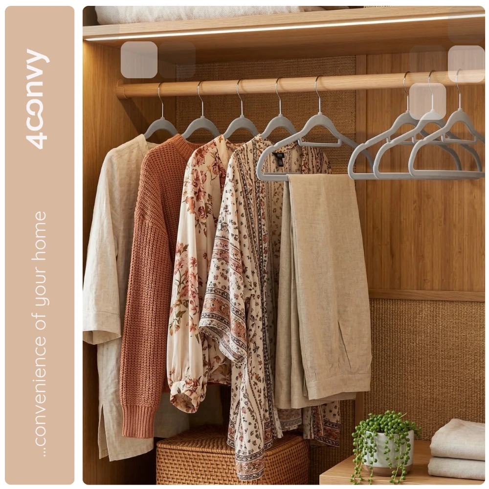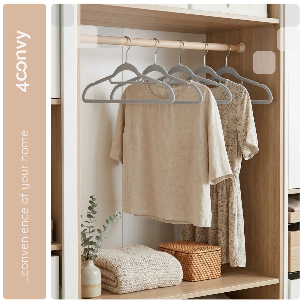 Wyposażone w solidne metalowe haki obracające się o 360°, nasze wieszaki umożliwiają łatwe zawieszanie i zdejmowanie z drążka – bez względu na kierunek czy przestrzeń w szafie.