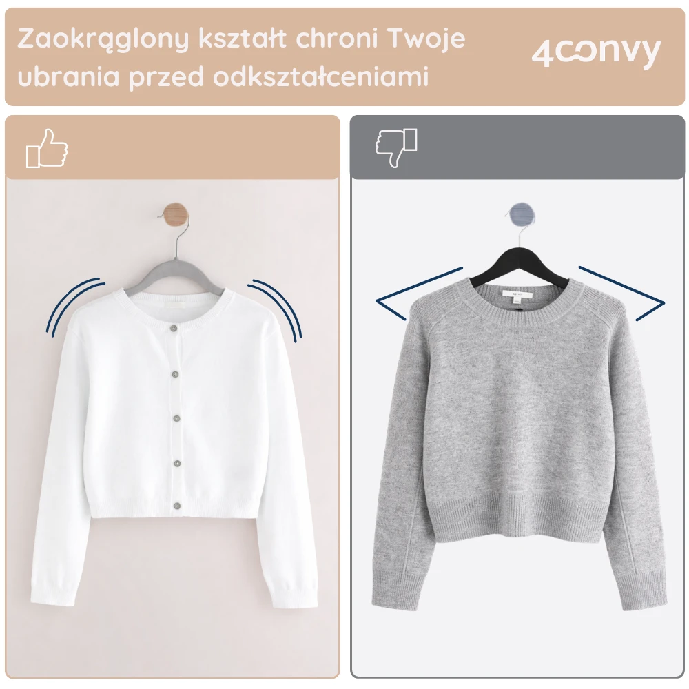 Dzięki odpowiednio wyprofilowanym, zaokrąglonym ramionom wieszaka, odzież nie odkształca się i zachowuje swój pierwotny wygląd.