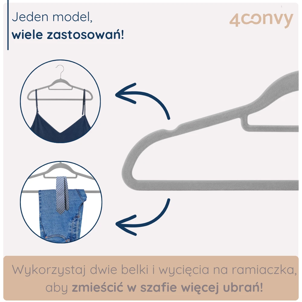 WIELE ZASTOSOWAŃ: Wieszaki 4CONVY o wymiarach 45 x 23 cm służą do wieszania różnego rodzaju ubrań, dzięki dodatkowym poprzecznym belką oraz wcięciom. Wykorzystasz je do koszul, koszulek, bluzek na ramiączkach, swetrów, spodni, szali/krawatów i innych ubrań.