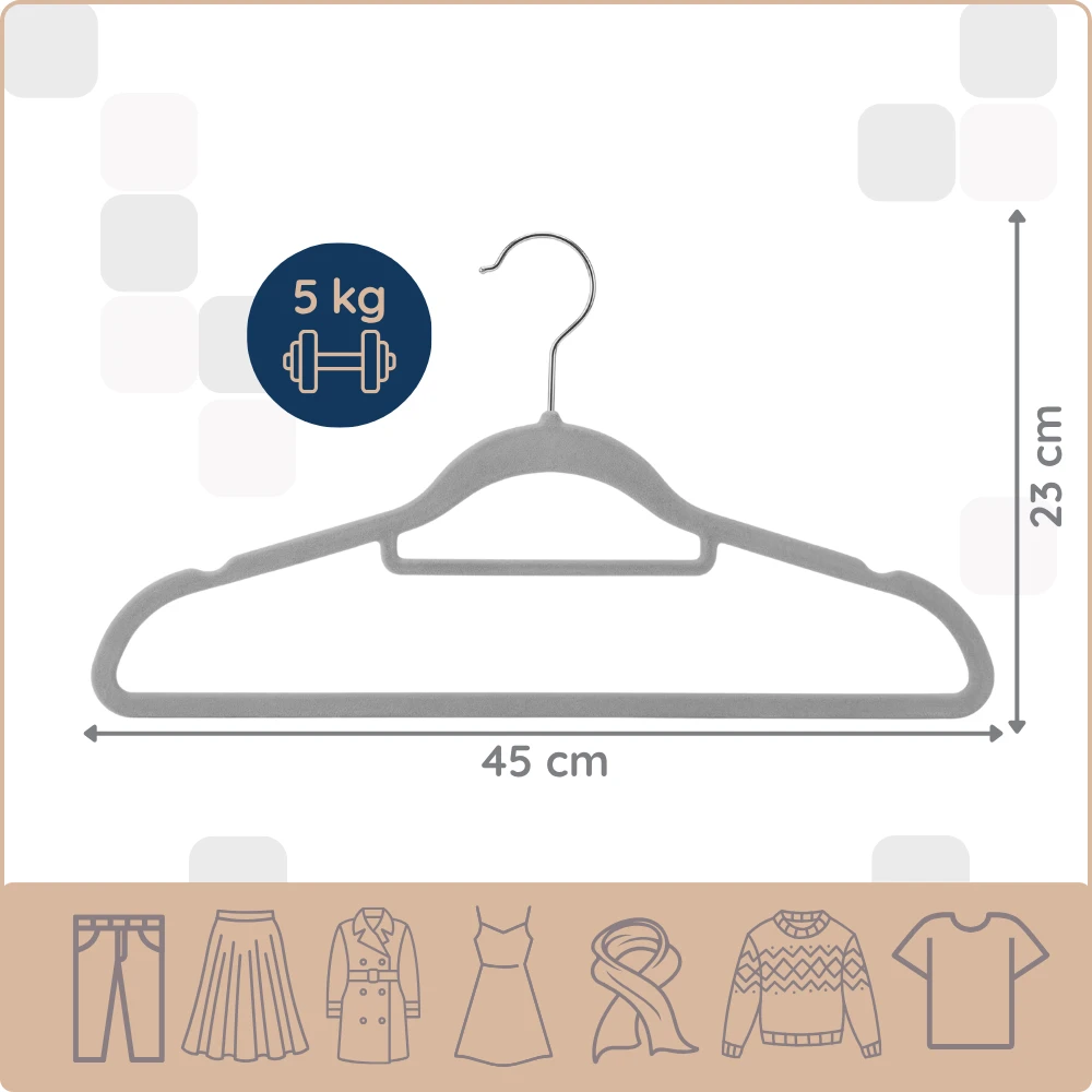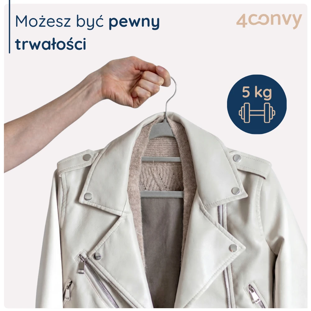 TRWAŁOŚĆ NA LATA: Przemyślana konstrukcja zwiększa możliwy udźwig wieszaka do 5 kg i sprawią, że posłuży Ci przez długi czas. Welurowa powłoka jest odporna na zarysowania i nie zostaje na ubraniach.